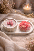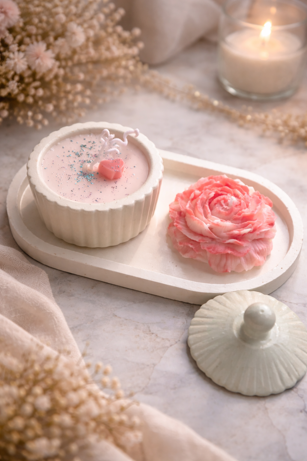 The peony pillar candle is designed as a decorative statement piece, inspired by soft floral forms, while the ceramic jar candle creates a warm, cozy ambience. Paired with a trinket tray for jewelry or small keepsakes, this set blends beauty with function effortlessly.